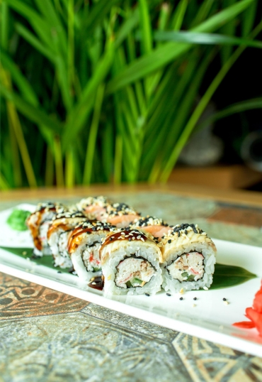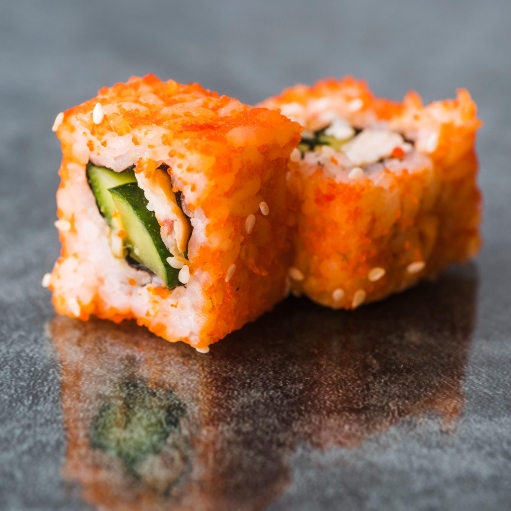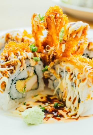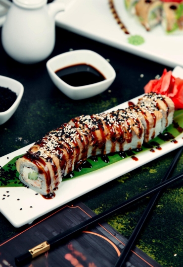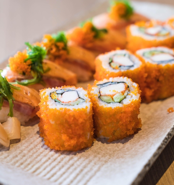 A vibrant roll layered with avocado, tuna, and salmon. The Dragon Roll blends taste and artistry, making it a favourite for sushi lovers across Leytonstone, Stratford, and nearby areas.